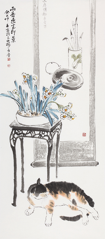 우향은 격물치지(格物致知) 하는 자세로 자신의 일상적 삶속에서 자신과 함께하는 동식물을 세밀하게 관찰하고, 그것의 생태적 속성을 예술적으로 담박하고 우아하게 승화시킨다. 주목할 것은 난 이외 고양이를 소재로 한 작업이다. 우향 작업실의 정황을 그린, 그림속의 그림에 해당하는 [우향화실즉경(雨香畵室即景)]을 보면 알 수 있듯이, 작가는 고양이와 살면서 고양이의 움직임 하나하나를 유심히 살펴보고 수없이 많은 스케치를 통해 그 고양이를 자신화한다.